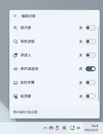 最后为了方便残障人士使用 Windows 上的辅助功能,Windows 22H2 还允许将辅助功能的面板添加到快速设置中,方便残障人士快速启用和关闭某些不需要长期开启的辅助功能。