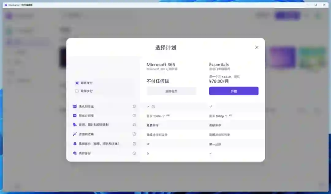 Clipchamp 已经经历过数次调价,此前的免费版权益在 22H2 中被包装成为了 Microsoft 365 订阅附带,付费版 78 元/月,在免费版的基础上可以获得更多在线素材以及品牌套件、内容备份功能。