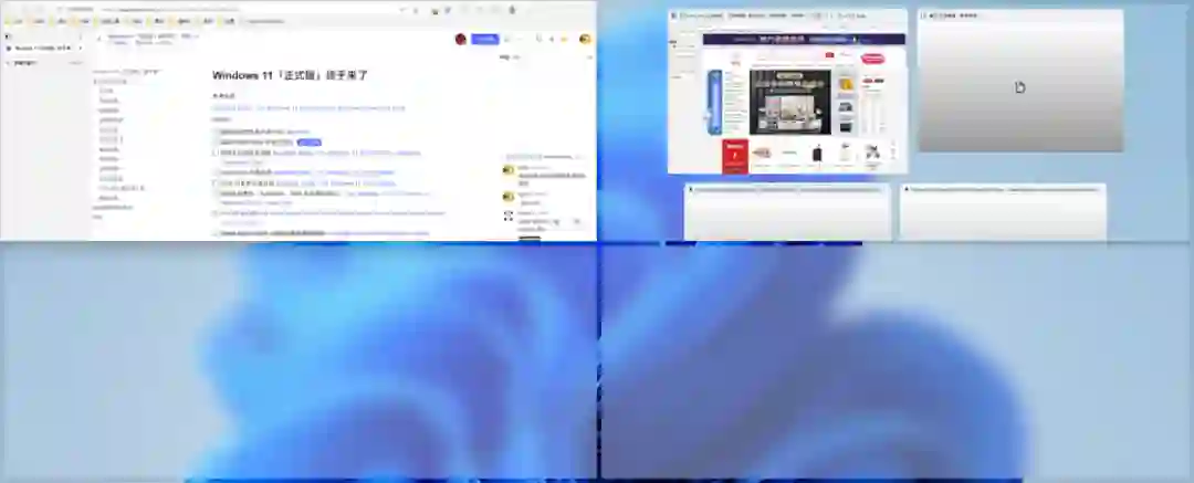 首先,和此前的多任务切换一样,贴靠布局在其中一个窗口完成贴靠时,其他窗口会依次出现在还没有窗口的贴靠区域中。而如果你使用的是 Edge 浏览器,那么 Edge 浏览器中的标签页此时也会以独立窗口的形式出现在建议区域,方便我们将多个浏览器标签页面同时排列在桌面上。