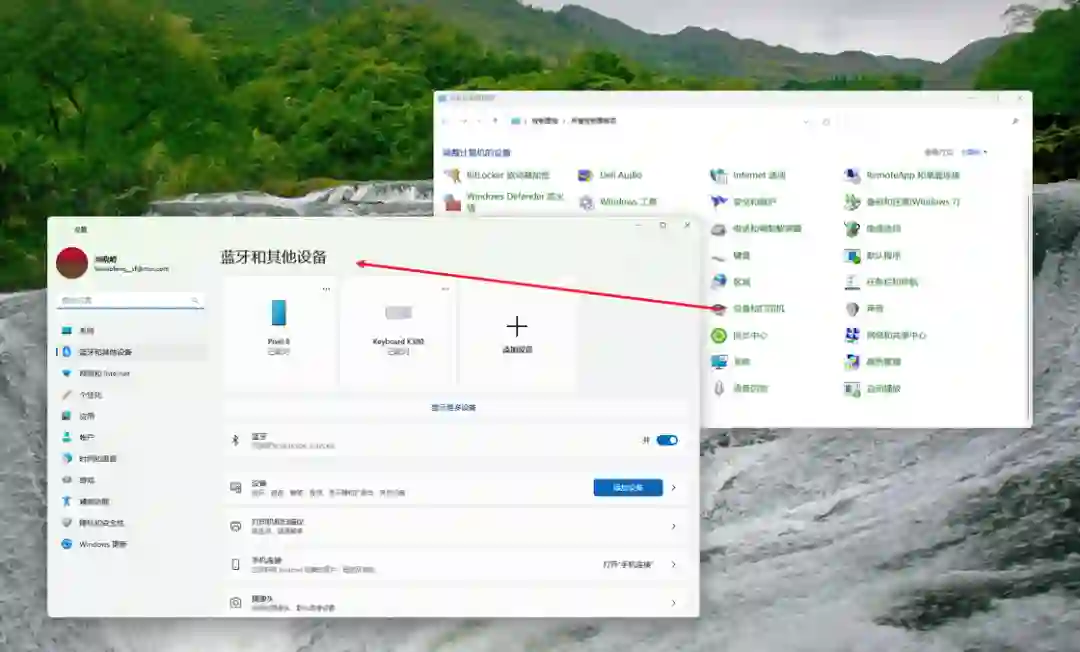其次就是控制面板中的「设备和打印机」现在也会重新跳转到「设置」-「蓝牙和其他设备」中,需要添加任何设备时也需要使用「蓝牙和其他设备」这个「新面板」才能添加。