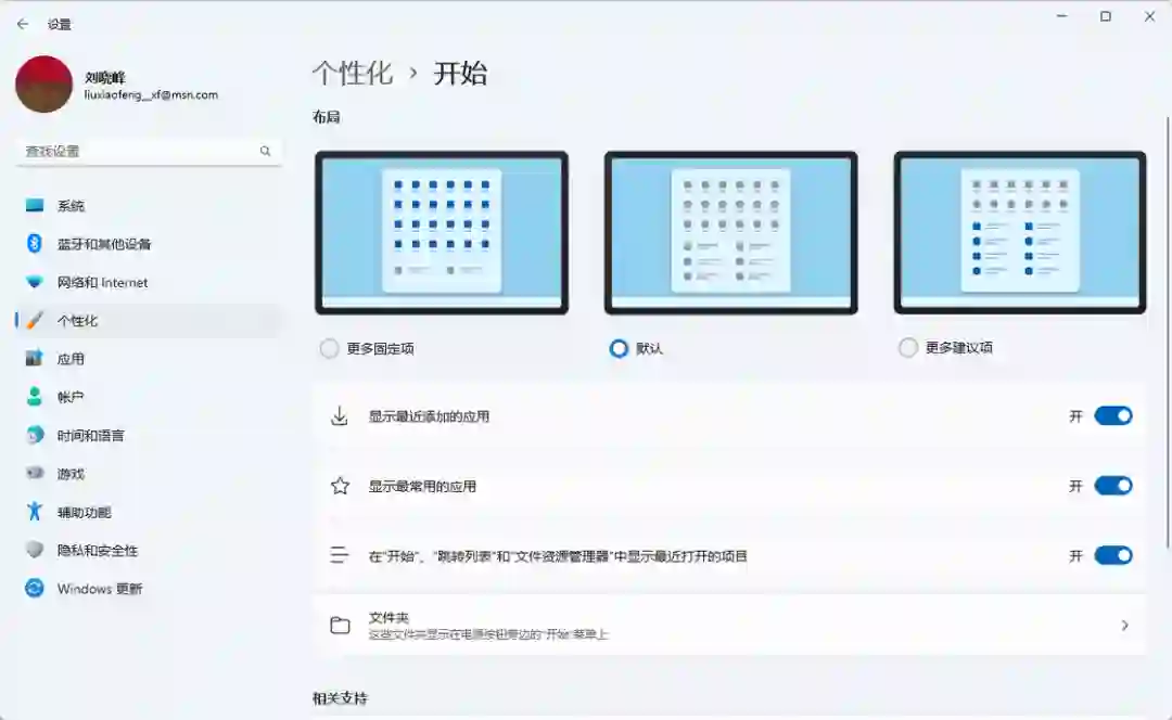 另外,在 22H2 正式版中,开始菜单的布局也可以根据我们的个人喜好进行适当微调了。在「系统设置 > 个性化 > 开始」页面中,我们可以从更多固定项、默认、更多建议项三种布局中选择更加符合自己使用习惯的开始菜单布局。