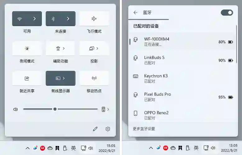 比如蓝牙,和此前只能简单控制开、关状态不同,21H2 中我们可以点击快速设置开关旁的箭头按钮来进入二级设置,然后直接在桌面右下角来查看更多信息或完成一些基础操作。Wi-Fi、投影、辅助功能等快速设置也是同理。