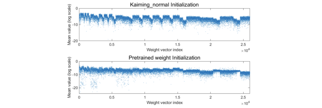 对ResNet50的不同初始权值进行可视化,可以看到权值都非常小(小于 ),这说明如果使用GC来训练,输出特征不会对输入特征的变化过于敏感。这个属性正则化输出特征空间,并且提升网络训练的泛化能力。