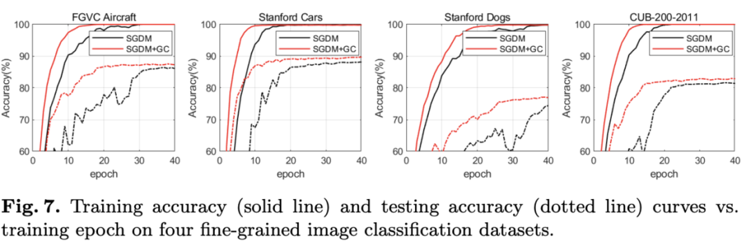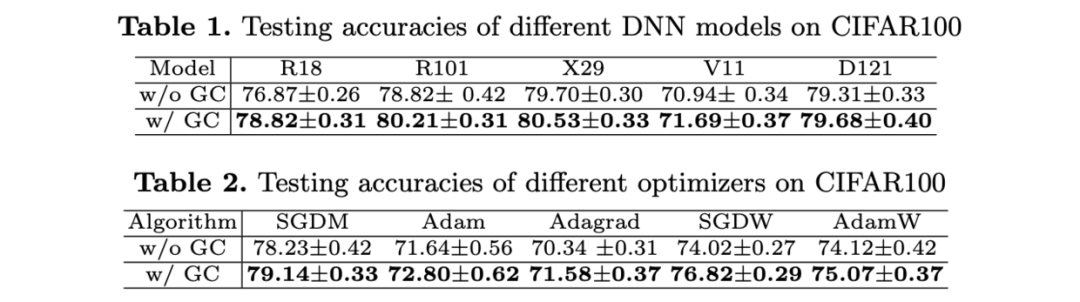 算法1和算法2分别展示了将GC嵌入到SGDM和Adam中,基本上不需要对原优化器算法进行修改,仅需加入一行梯度零均值化计算即可,大约仅需0.6sec。