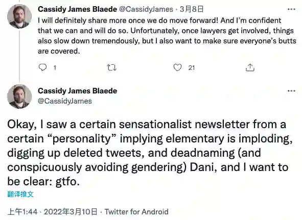 彼时 elementary 创始人 Daniel Foré 直言公司财务状况出现了问题,随后其将愤怒的炮火对准另一位联合创始人、也是 elementary 公司的首席体验官 Cassidy, 并连续发了十多条 Twitter,诉述 「在没有提前沟通的情况,Cassidy 离职接受其他公司的全职工作就罢了,还狮子大张口,想要在离职时,索要 3 万美元,未来 10 年还要 7 万美元,并要保留公司 5% 的股份。」