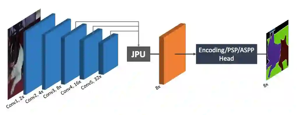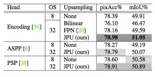 因此,新方法将原版 FCN 作为主干网络,同时运用 JPU 对输出步幅(OS)为 32 的低分辨率最终特征图执行上采样,从而生成一个高分辨率特征图(OS=8)。因而,整个分割框架的计算时间和内存占用大幅减少。与此同时,以 JPU 替代扩张卷积时,性能不会出现损失。研究人员将此归因于 JPU 能够利用跨多级特征图的多尺度语境。
