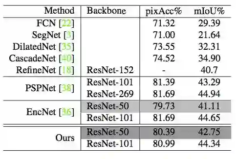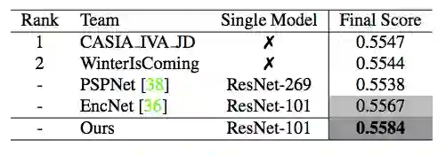 表 5:在 ADE20K 测试集上的结果。前两项在 2017 年的 COCO-Place 挑战赛中分别排名第一和第二。