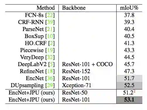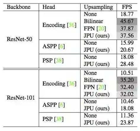 为了验证该方法的有效性,研究人员首先进行了系统性实验,证明 JPU 可以取代多种流行方法中的扩张卷积,且不会引起性能损失。之后,研究人员在多个分割基准上对提出的方法进行测试。结果显示,该方法可以实现当前最佳性能,并且运行速度提高了两倍以上。