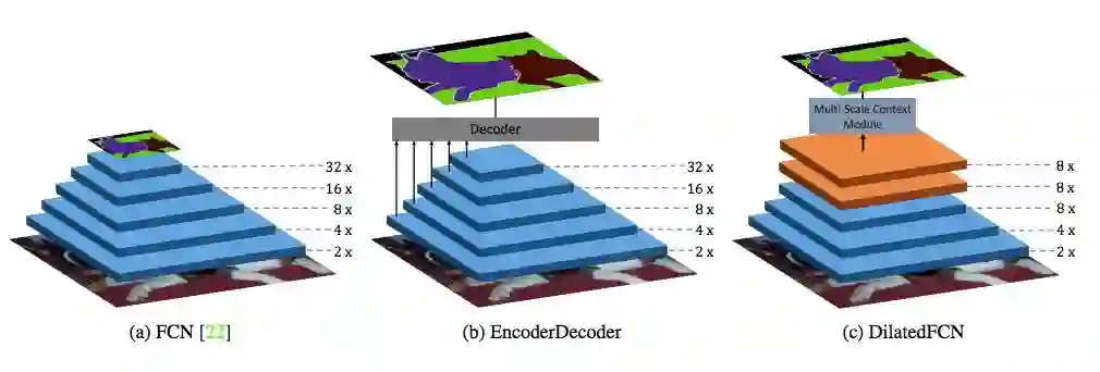 此外,DeepLab [5] 从原版 FCN 中移除最后两个下采样操作,并引入扩张(空洞)卷积以保持感受野(receptive field)不变。紧随 DeepLab,[38, 6, 36] 在最终特征图之上应用多尺度语境模块(context module),其性能在多个分割基准上明显优于大多数 EncoderDecoder 方法。如图 1c 所示,DilatedFCN 的最终特征图的空间分辨率是原版 FCN 的四倍,因而保留了更多结构和位置信息。