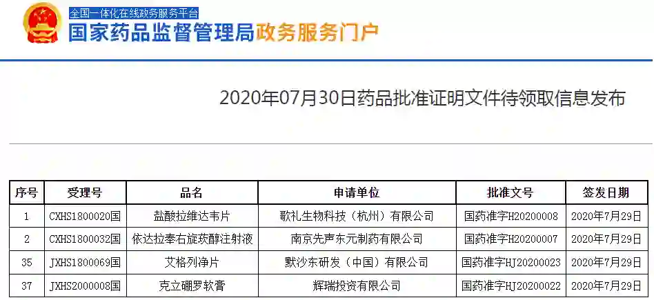 7月30日,根据NMPA药品批件发布通知显示,4款创新药获批中国上市,分别为歌礼丙肝药拉维达韦、先声脑卒中药依达拉奉右旋莰醇、默沙东降糖药艾格列净和辉瑞湿疹药克立硼罗。