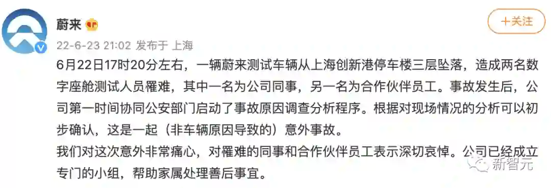 6月22日17时20分左右,一辆蔚来测试车辆从上海创新港停车楼三层坠落,造成两名数字座舱测试人员罹难,其中一名为公司同事,
