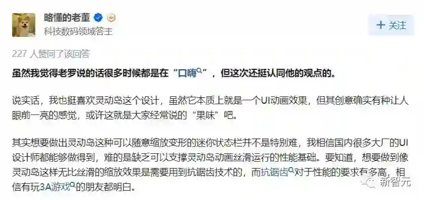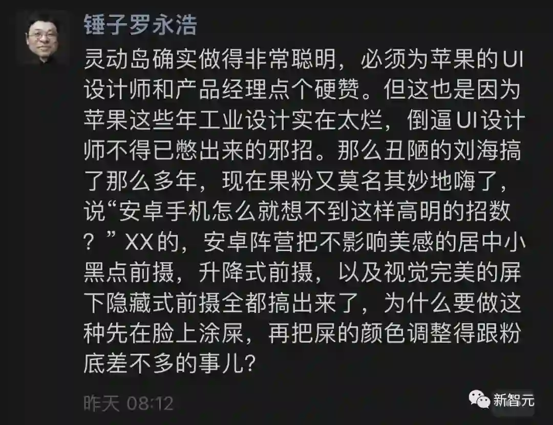 老罗在朋友圈发文硬赞灵动岛,称其是「UI 设计师不得已憋出来的邪招」。