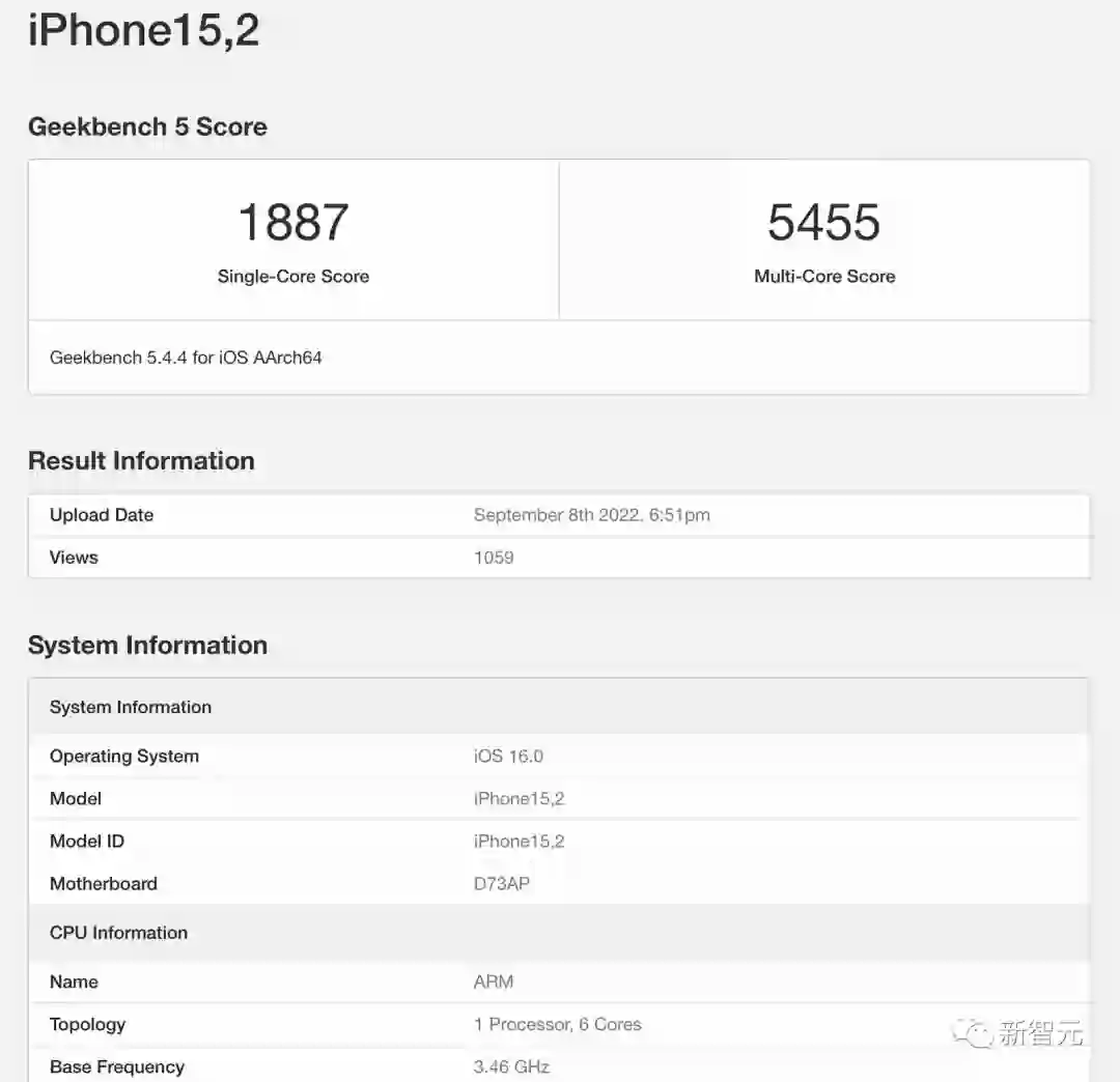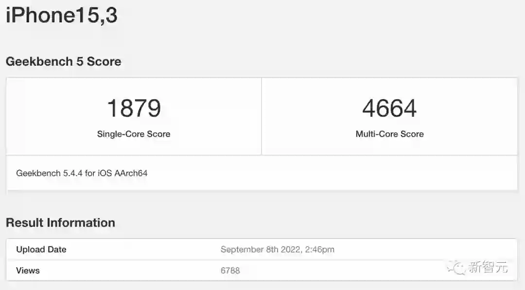 一个代号iPhone15,3,也就是iPhone 14 Pro Max的Geekbench测试结果显示,A16的单核得分为1879,多核得分为4664。