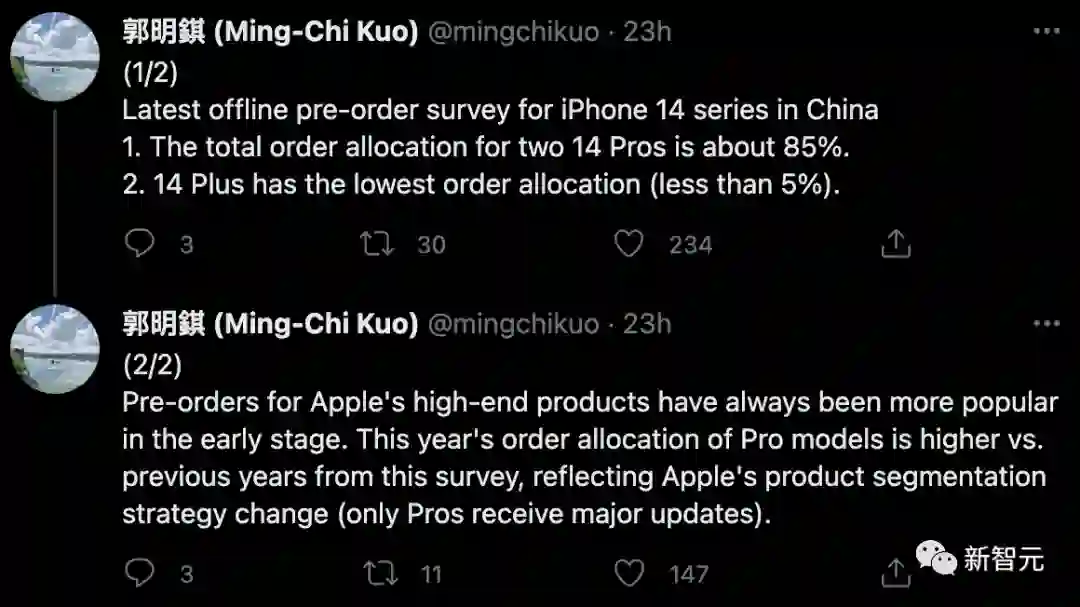 著名分析师郭明錤表示,根据中国线下预购的调查数据,Pro和Pro Max占了总订单分配的85%,而14 Plus只有不到5%。