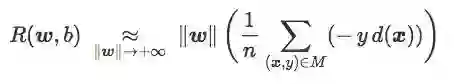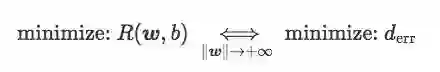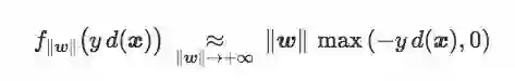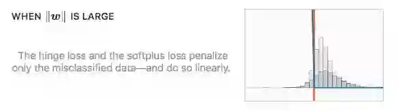换句话说,当‖w‖足够大时,最小化hinge loss和softplus loss的期望风险就等于最小化误差距离,也就是最小化训练集上的错误率。