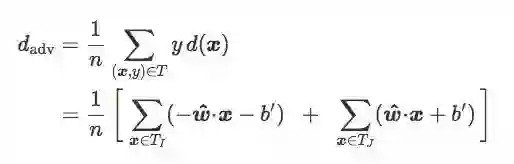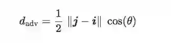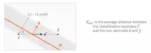 综合以上推算,在给定训练集T上,如果两个质心‖j−i‖之间的距离是个固定值,那对抗距离dadv仅取决于倾斜角θ。通俗地讲: