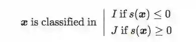 设存在一个包含n对(x,y)的训练集T,其中x是图像样本,当x∈I时,y=-1;当x∈J时,y=1。下面是T的三种分布:
