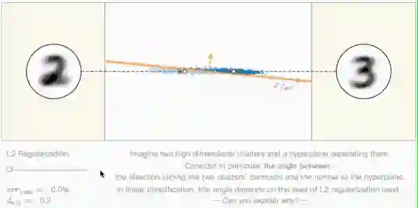 在这类线性分类问题中,通过调整L2正则化的水平,我们能不断调整这个垂直方向的角度。但是,你能解释这是为什么吗?