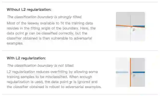 分类边界不倾斜(L2正则化)。L2正则化防止过拟合的思路是允许一小部分数据被分类错误,如噪声数据p。忽略它后,分类器在面对对抗样本时更稳健了。