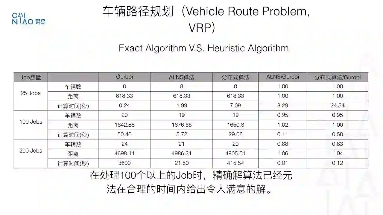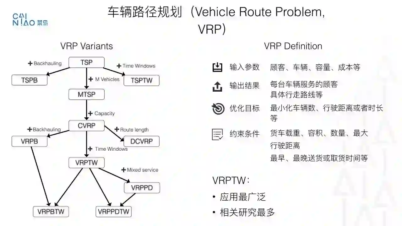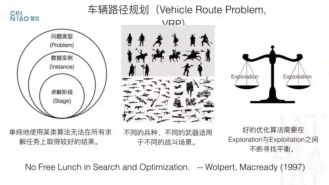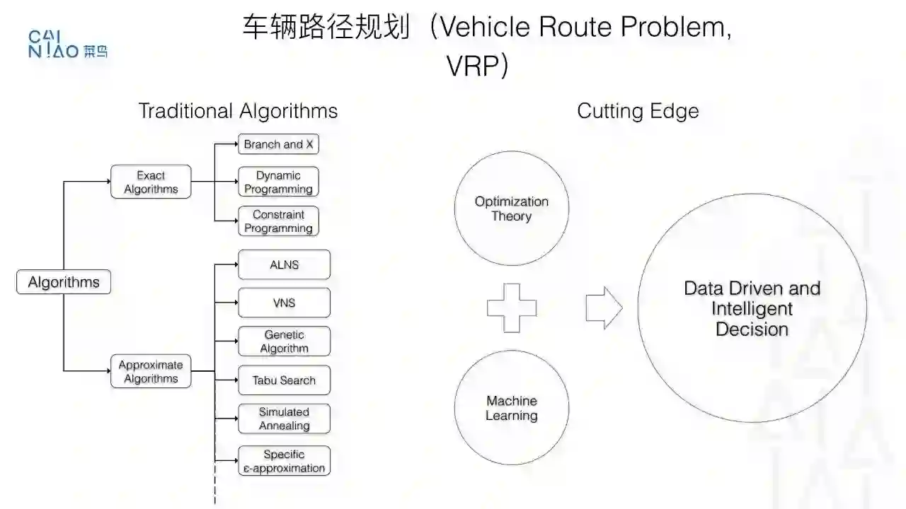 作为优化领域历史悠久的问题, 车辆路径规划问题已经被研究了数十年,我们从菜鸟自身的技术背景出发, 充分利用自身庞大的计算资源为优势,探索一条结合运筹优化、分布式计算、机器学习、人工智能结合的技术路线。