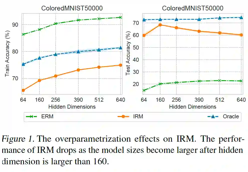 DRO 和 IRM 由于在小模型和数据集上具有良好的性能。但是应用于过参数化的深度神经网络中却不太理想,其中主要的原因是过参数化的 DNN 可以很容易地将 DRO 或 IRM 的正则化项降至零,同时仍然依赖于伪特征,即所谓的 over-fitting。