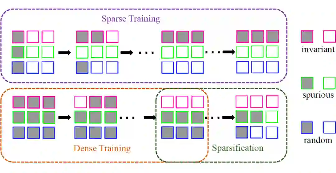该方法核心思想是在整个训练过程中采用稀疏性约束作为防御,以防止虚假和随机特征泄露到我们所研究的子网中。相比于传统的先训练模型再做稀疏化,本文训练时同时进行不变风险最小化和稀疏训练。直观上,在训练过程中,由于稀疏性约束,我们所工作的子网太小,无法包含所有的虚假和随机特征,因为这些特征的数量总是明显大于不变特征。因此,为了实现更小的损失,网络必须识别和关注不变特征。本文采用了最新的稀疏训练方法来解决稀疏不变风险最小化问题。