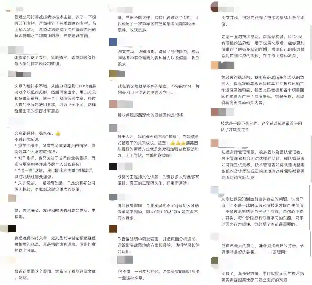 作为一门为管理者提供领导力的课,专栏重点从「术」和「案例」方面,分享了很多技术同行的实战经验。内容不局限于管理,还有创业、技术趋势、职场、国家政策解读等方面内容,不仅有业内大牛的私密实践干货分享,也有他们对行业、管理、技术、职业的思考与洞察。
