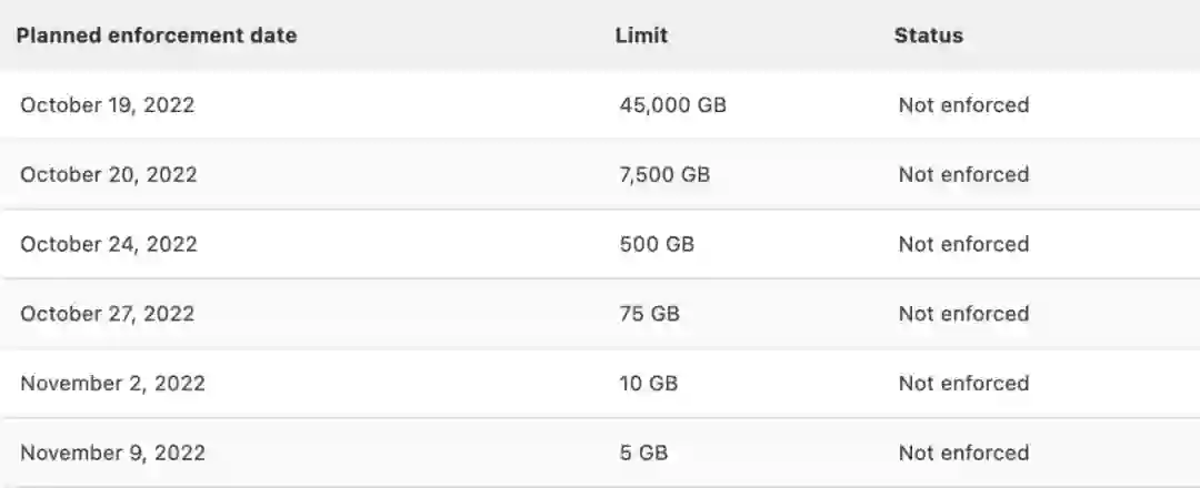 根据官方公布的时间表,针对命名空间存储限制,GitLab 将先从 45000 GB 开始往下实施,逐步降低,并最终将其限制到 5 GB。