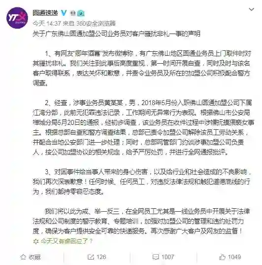 圆通称,对因事件给当事人带来的身心伤害,以及给行业和社会造成的不良影响,我们再次深表歉意!任何时候、任何员工,对违反法律法规和触犯道德底线的行为,我们都持零容忍态度。