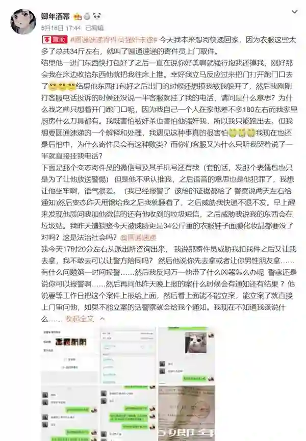 日前,一位网友在微博称圆通快递员上门取件时对其进行骚扰非礼。据该女孩讲述,圆通快递员上门取件时强抱强摸猥亵,她报警后快递员仍发微信不断威胁,并扬言不会给她寄件,她的东西会在垃圾站。女孩在事情发生后,拨通圆通客服电话反映情况投诉,但说到一半,客服就将电话挂断,之后圆通甚至打电话要求女孩删掉微博。