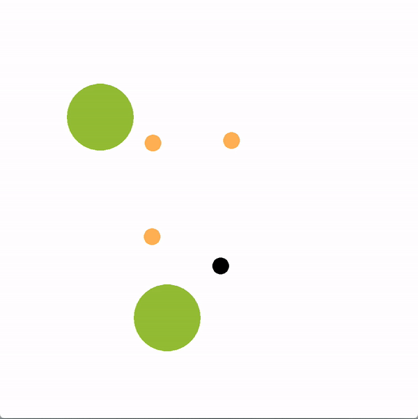 在下面的图中,绿色的圆圈代表位置(或目标),橙色的圆圈代表模拟的人类智能体,黑色的圆圈代表机器人。机器人正试图带领团队走向更理想的底部位置。我们将使用图结构的机器人(上)与贪婪地瞄准最优目标的机器人(下)进行对比。