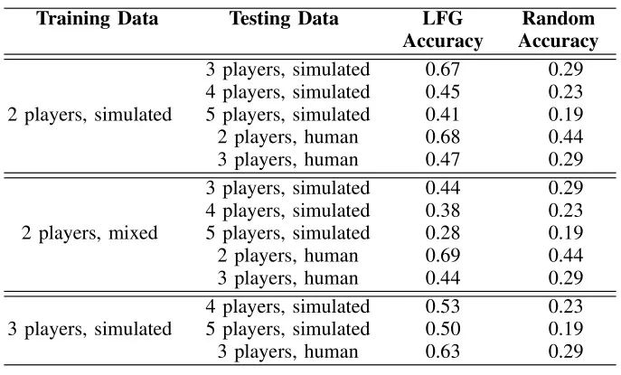 通过将领导者-追随者图所做的预测与真实落地的预测进行比较,来评估我们的模型泛化的准确性。用模拟数据和同时包含模拟和真实人类数据的数据(混合数据)进行训练实验。我们发现,训练更多的智能体有助于模型的推广。这表明,需要权衡使用较少的智能体进行训练还是使用量较多的智能体进行训练(这需要收集更多的数据)。