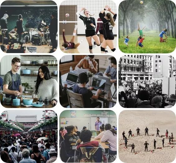 团体协作的例子包括协作烹饪、抗议和在拥挤的空间中穿行。