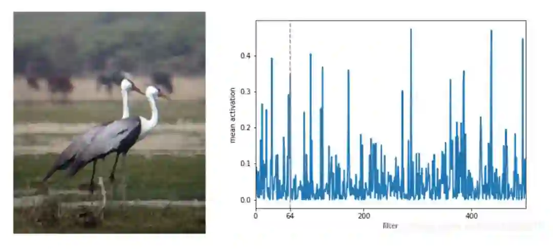 我们发现了多个高响应的特征图。上面的特征图有像是鸟腿、眼睛和喙的东西?但是下面的特征图,看不出来是什么,可能与图像的背景有关,或者一些只有网络能理解的东西。这部分现在仍然是黑匣子。也许之前的猜想是错的。