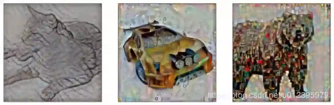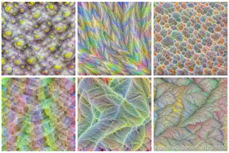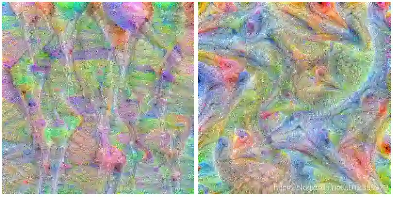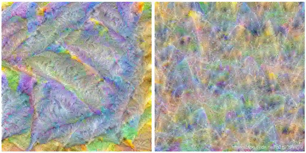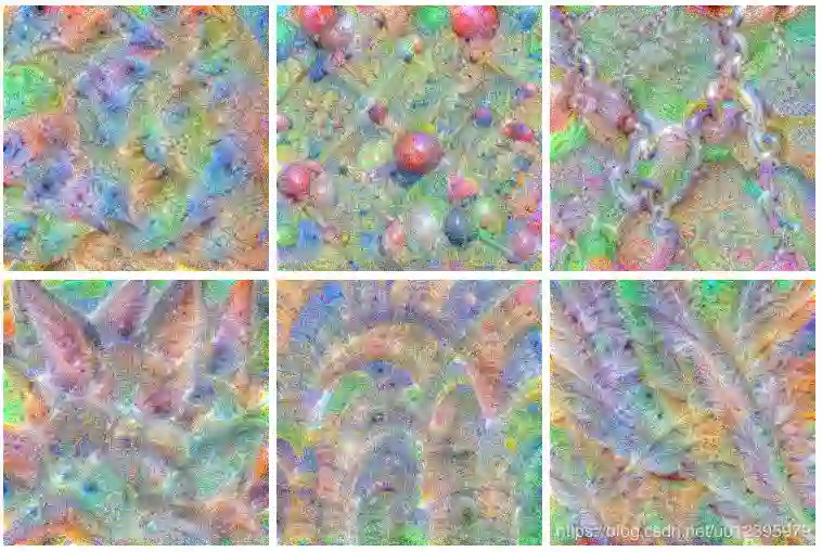 这些得到的中间结果看着非常漂亮。方法就是在网络中最大化某个激活值就可以得到这些结果。看一下第 40 层的几张图。已经有了明显的形状。比如羽毛、铁链等。接下来我们分析一下这些结果。