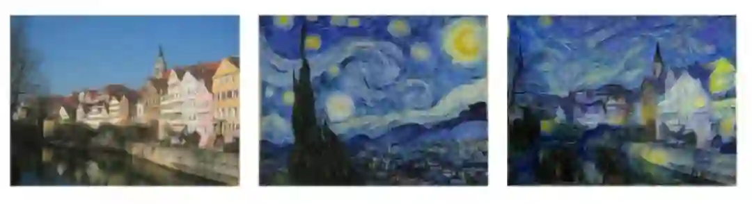其实接触过图像风格迁移技术的技术人员应该都非常清楚,深度学习模型在里面提取的图像的绘画风格就是纹理特征。贴上一张经典图片,生成的是一张具有梵高《星月夜》图画风格的建筑图片。
