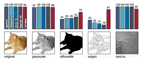 作者通过实验,采用了多个神经网络(AlexNet、VGG-16、GoogLeNet、ResNet-50、ResNet-152、DenseNet-121、SqueezeNet1_1)进行输出结果。为了对照,还召集了大约 100 名人类来做对照实验。这个实验结果就是一只带有象皮纹理的猫被深度神经网络判断为大象,但对人类来说仍然是猫。带有时钟纹理的汽车被深度神经网络判断为时钟,带有水瓶纹理的熊被深度神经网络判断为水瓶。显然!该实验支持了这一说法,即目前用于物体识别的深度学习技术主要依赖纹理,而不是物体形状。