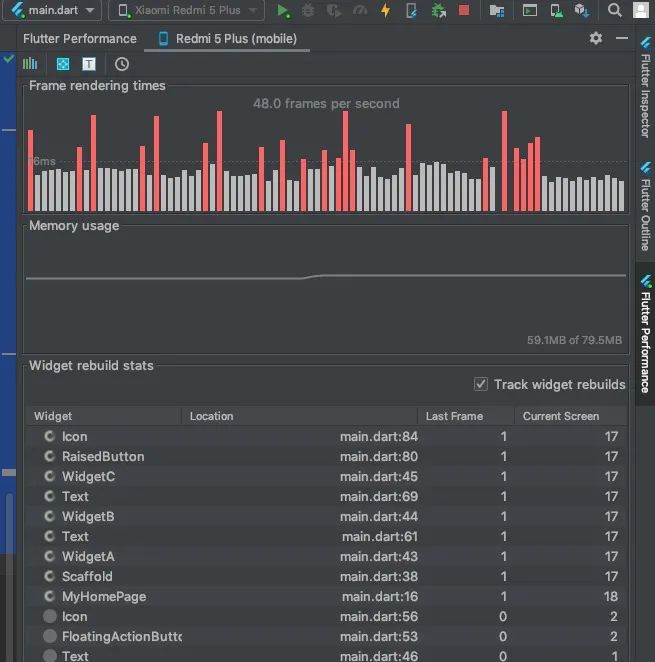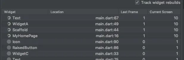 在 Flutter Performance 面板上选中 Track Widget Rebuilds 即可看到