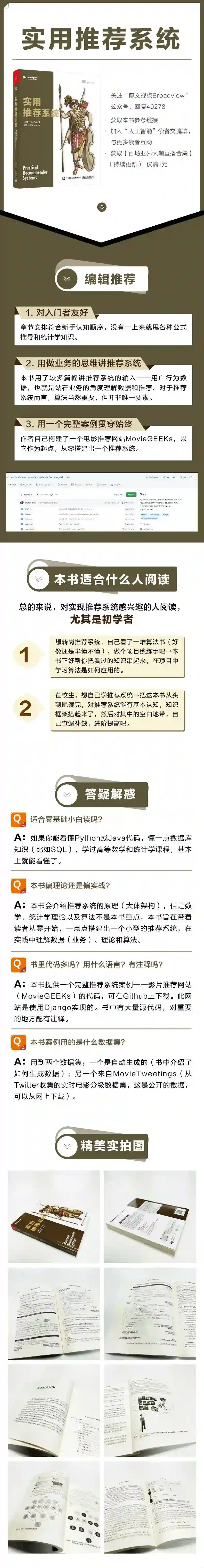 要构建一个实用的“智能”推荐系统,不仅需要有好的算法,还需要了解接收推荐的用户。本书分为两部分,第一部分侧重于基础架构,主要介绍推荐系统的工作原理,展示如何创建推荐系统,以及给应用程序增加推荐系统时,应该如何收集和应用数据 ;第二部分侧重于算法,介绍推荐系统算法,以及如何使用系统收集的数据来计算向用户推荐什么内容。作者还教授了如何使用最流行的推荐算法,并剖析它们在 Amazon 和 Netflix 等网站上的实际应用。