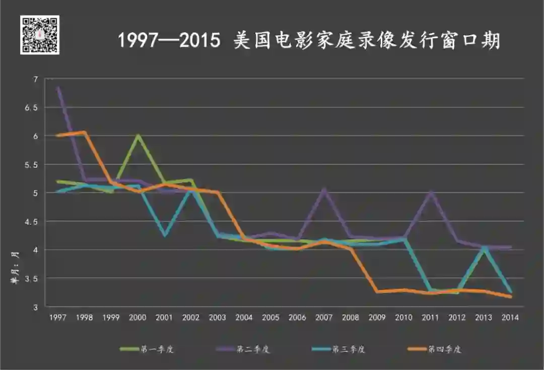 从1997年到2015年的近20年间,好莱坞电影的窗口期在不断缩短。进入2012年以后,六大影业的窗口期已经从将近6个月缩短到了90天。