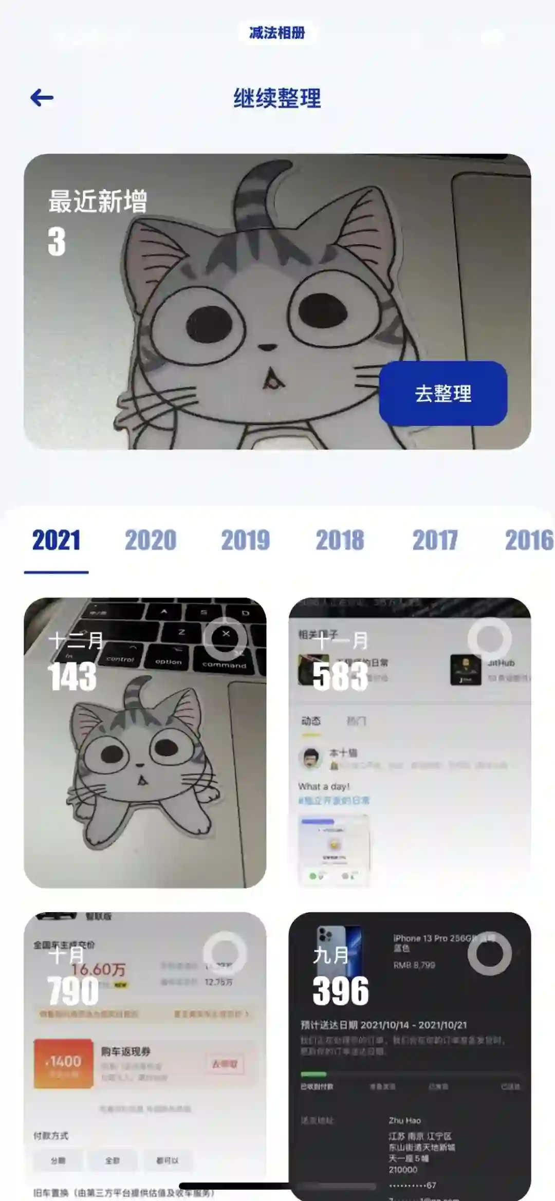 从上图可以看到,2021 年之前的记录都按照年份和月份统计了照片张数,当我们选择一个月份点进去时就可以对当月照片进行整理,即使整理到一半也可以点击完成,剩下的内容留作下次。这十分符合我一贯做事的习惯。