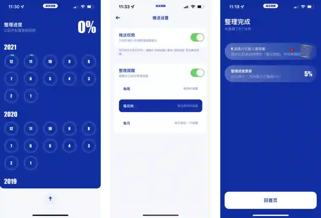 值得一提的是,一次简单的整理过后,首页顶部弹出的整理进度提示让人觉得贴心不少,这让我对于现在的整理进度有一个明确的认知。同时,在知晓用户的照片未整理完的前提下,减法相册支持对照片整理设置定期提醒,用户可以以每周末、每双周末和每月最后一天任选其一的方式进行提醒。