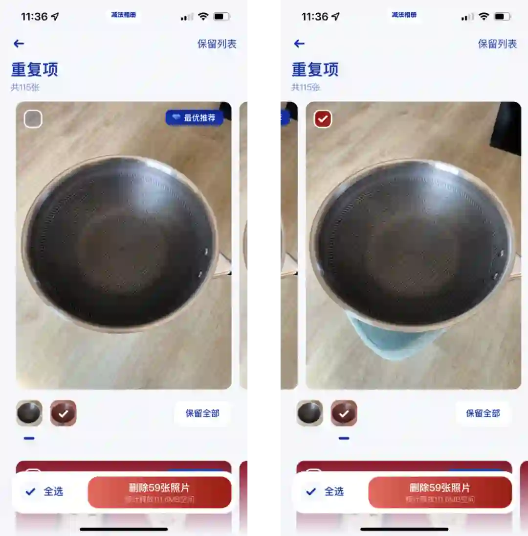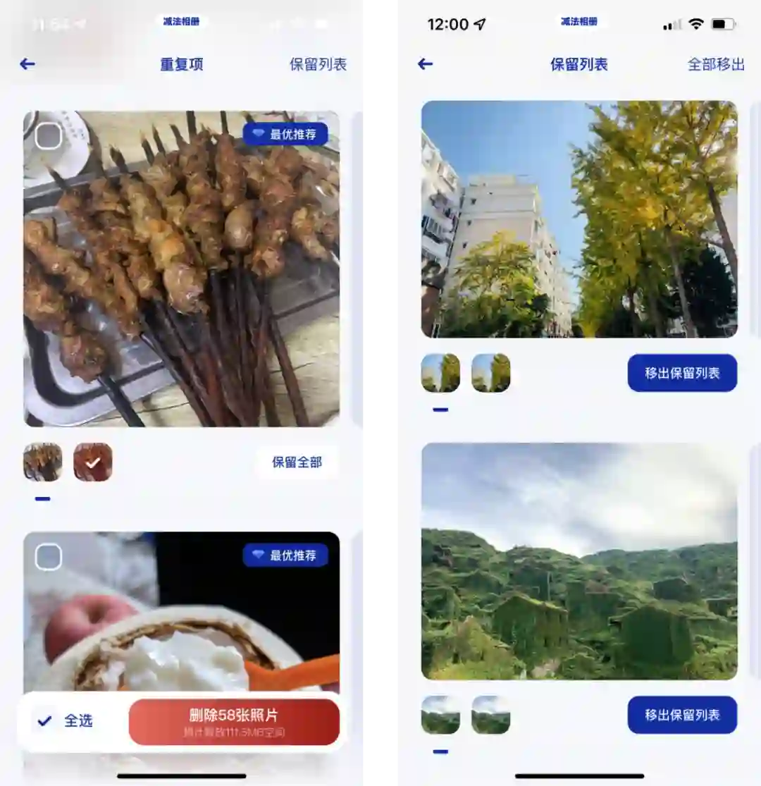 重复照片的识别和最佳画质的推荐,这两点减法相册也都做到了。捎带一提,如果对于重复的照片希望不被扫描直接保留,减法相册也提供了易懂的交互,允许将照片直接放到保留列表。在机器识别的层面上照顾到用户的意图和手动操作体验,是友好且负责任的交互设计。