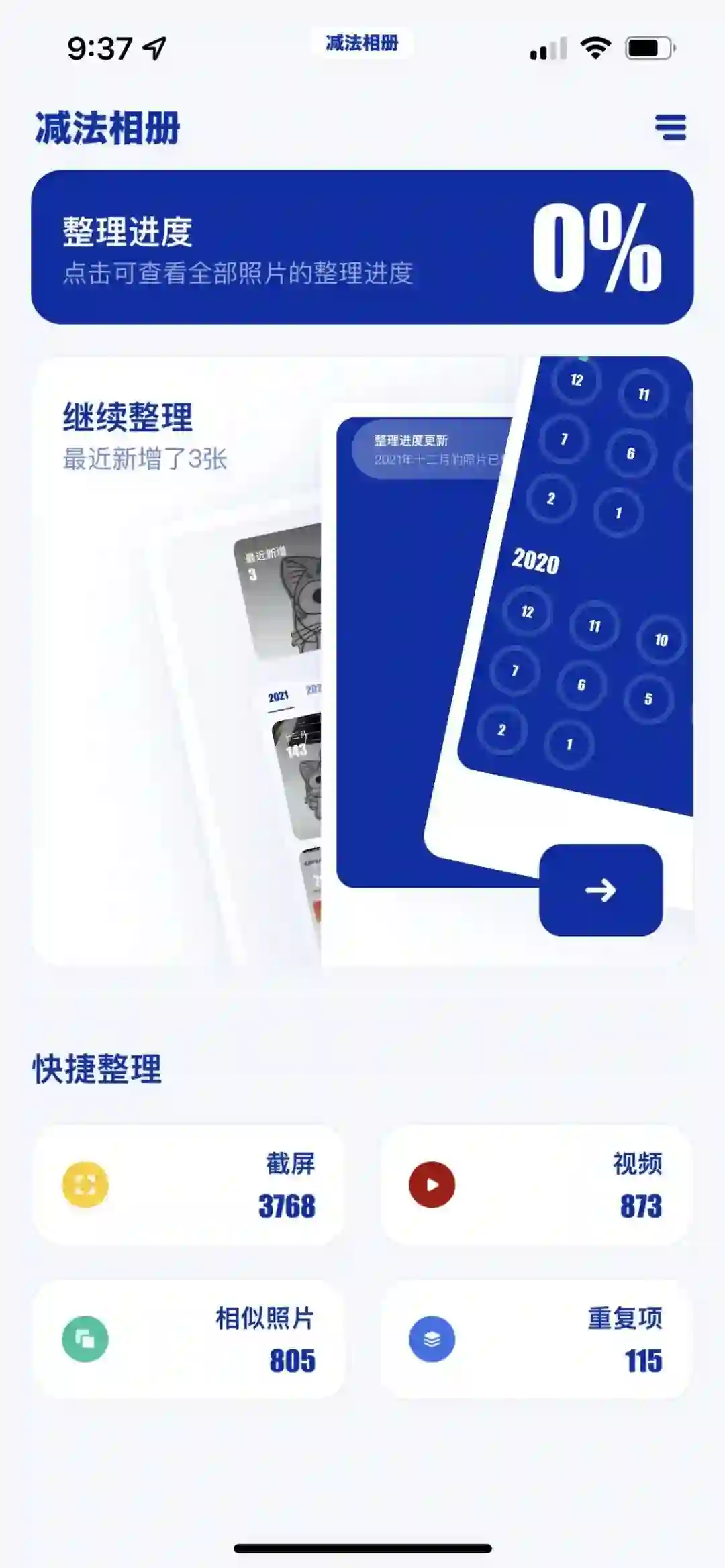 这一点在其他相册整理 app 中都意外地没有看到,减法相册的主操作逻辑恰好是对历史照片按时间维度统计,让用户选择一个月份查看的同时进行整理,当有照片新增时,也可以只针对增量的内容进行整理。