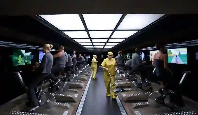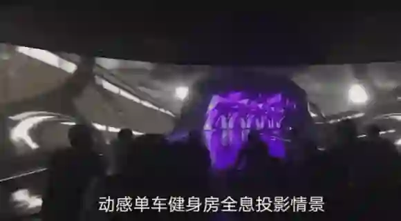 这个沉浸式健身房里里的动感单车,结合了沉浸式投影,随着你脚蹬单车,前方的屏幕上会出现不断变换的场景。
