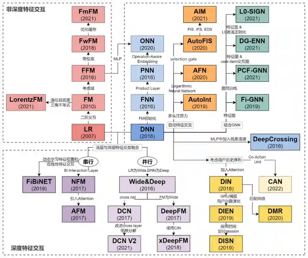 其中,严格来说3、4、5三个部分也属于深度特征交互这一类,但因为其各自有明显的特点,因此将它们单独归类。读者可以选择自己不熟悉的方向进行阅读。