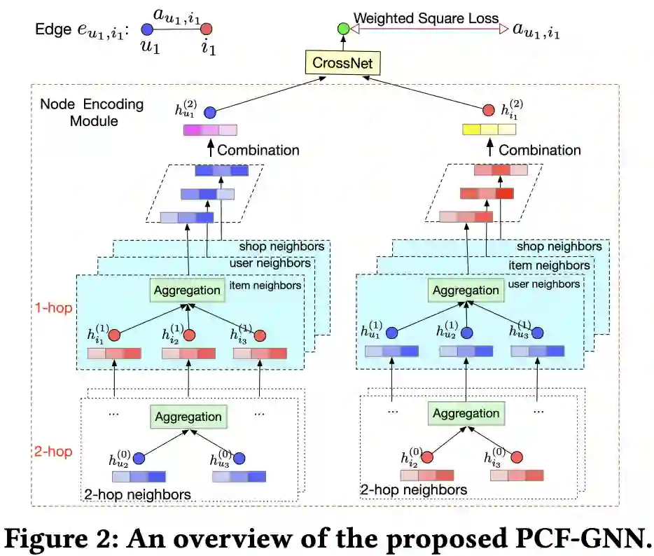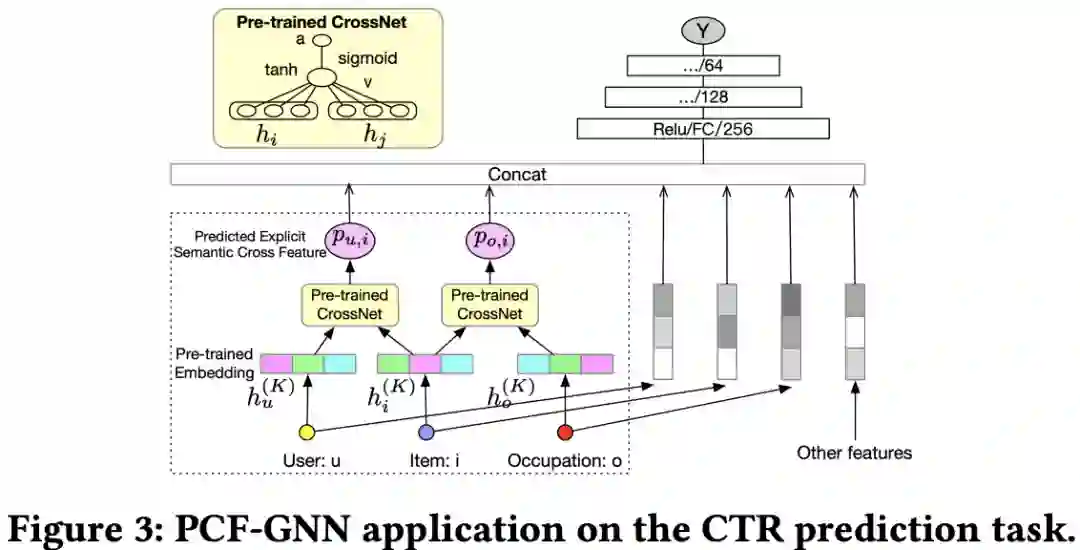 和Fi-GNN用端到端建模不一样,PCF-GNN是一个两阶段的模型。第一阶段是GNN的预训练:通过构建一种基于特征共现关系的GNN,节点表示每一个特征,边的权重为特征共现度,显式地建模特征共现目标。进行相应的预训练(没有像Fi-GNN一样用多头注意力机制学习节点初始表示),显式地预测和输出特征的交互关系,对于没有出现过的新的交互,也可泛化预测。第二阶段是下游的应用:GNN可以固定参数,作为交互特征提取器,在应用的阶段首先推断出交互特征的值,然后和其余特征拼接在一起作为后面DNN的输入;也可以做预训练的范式,在下游CTR模型训练过程中微调GNN,更新每个特征的表示。