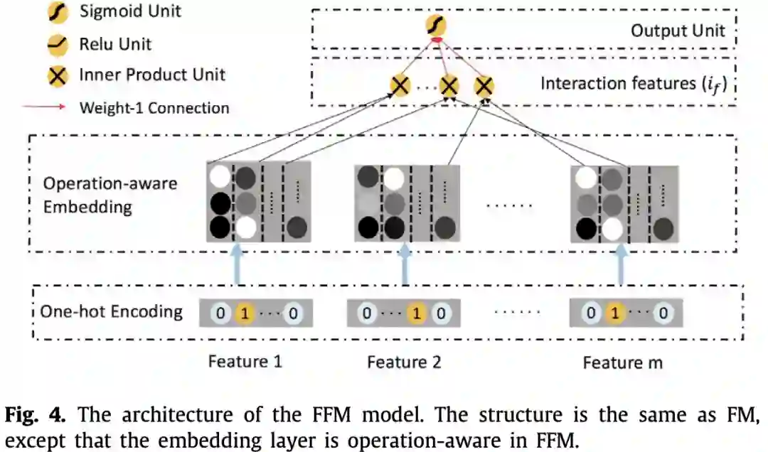 FmFM(FM^2)可以看做FwFM的升级版,并且FM、FwFM等模型都可以统一到FmFM框架下,并通过embedding向量维度和中间向量缓存优化,在模型效果持平的前提下,提升计算效率。具体来讲,特征 F(i) 与特征 F(j) 交叉时,引入矩阵M,特征 F(i) 对应向量先与矩阵相乘得到中间向量,再与特征 F(j) 对应向量点积。FM和FwFM可以统一到该框架下。FM在进行二阶特征交互时,特征对应向量直接进行点积,等价于把FmFM中的M矩阵设置为单元矩阵(对角线全为1)。FwFM进行特征交互时,每对特征引入权重 ,等价于把FmFM中的转化矩阵设置对角线全为 r 的矩阵(非对角线为0),矩阵参数可学习,对角线元素相同。