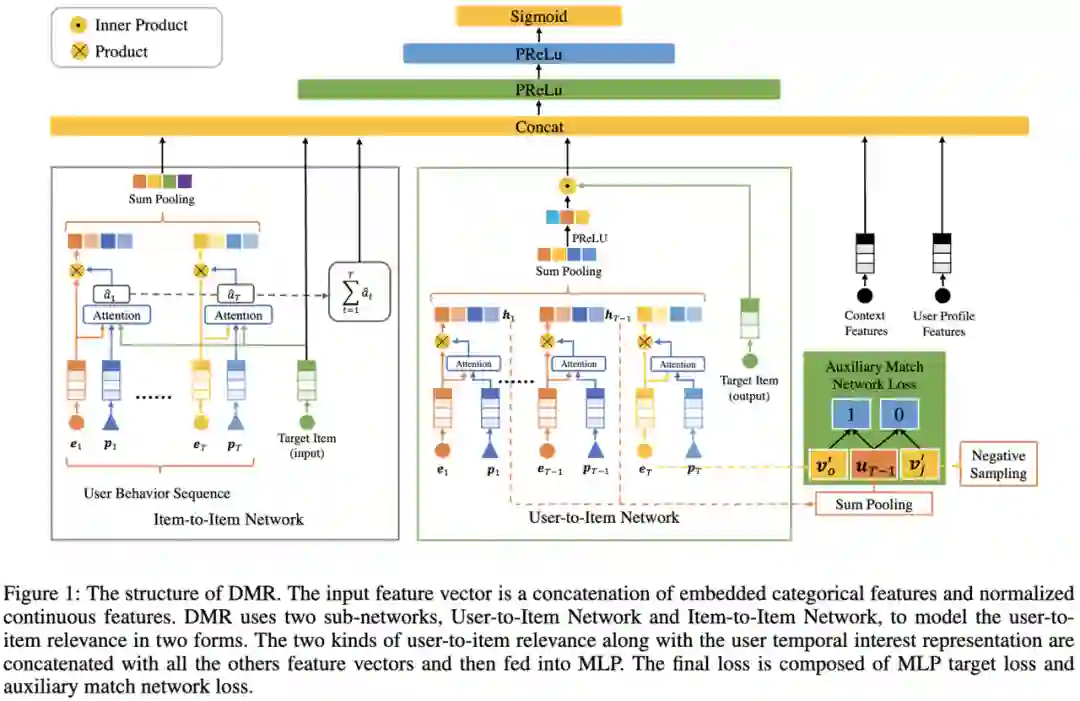 现有工作主要集中在用户表示上,很少关注用户和物品之间的相关性。本文提出了一种深度匹配排名方法(DMR),将协同过滤与匹配的思想相结合,用于CTR预测中的排名任务。模型分为user-to-item网络和item-to-item网络两部分。在user-to-item网络中,借助协同过滤的思想,通过embedding空间中相应表示的内积直接计算用户与物品之间的相关性,从用户行为中提取用户表示。考虑到最近的行为可以更好地反映用户的时间兴趣,使用注意力机制来自适应地了解每种行为在行为序列中的位置的权重。本文也提出了一个辅助匹配网络,帮助更好地训练user-to-item网络。辅助匹配网络可看作是一种匹配方法,其任务是根据用户的历史行为来预测下一个要点击的项目,DMR需要同时训练匹配模型和排名模型。在item-to-item网络,与DIN类似,通过包含位置信息的注意力机制,计算用户交互物品与目标物品之间的物品之间相似度,然后进行聚合,以获得另一种形式的用户与物品的相关性表示。