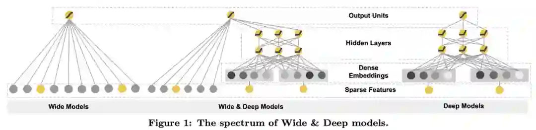 Wide&Deep 是由Google于2016年提出的,是推荐领域取得较大成功的最早深度模型。模型包括Wide和Deep两个部分,Wide 部分为 LR,这部分对样本中的特征与目标有较为明显的关联进行记忆性学习,即对于样本中出现过的高频低阶特征能够用少量参数学习,缺点是泛化能力差;Deep部分为DNN,旨在学习到样本中多个特征与目标之间的隐式关联,对于少量出现过的样本甚至没有出现过的样本能做出预测。在Wide&Deep的框架下,一个优势是Wide部分可以沿用之前非深度特征交互的成果,尤其是特征工程部分。这一点也促进了之后DeepFM等工作的诞生。